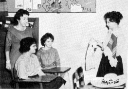 Carol Steffer displays Mexican clothing to Janice Legge, Nancy Colasanti and Mary Hafeli during Spanish class.